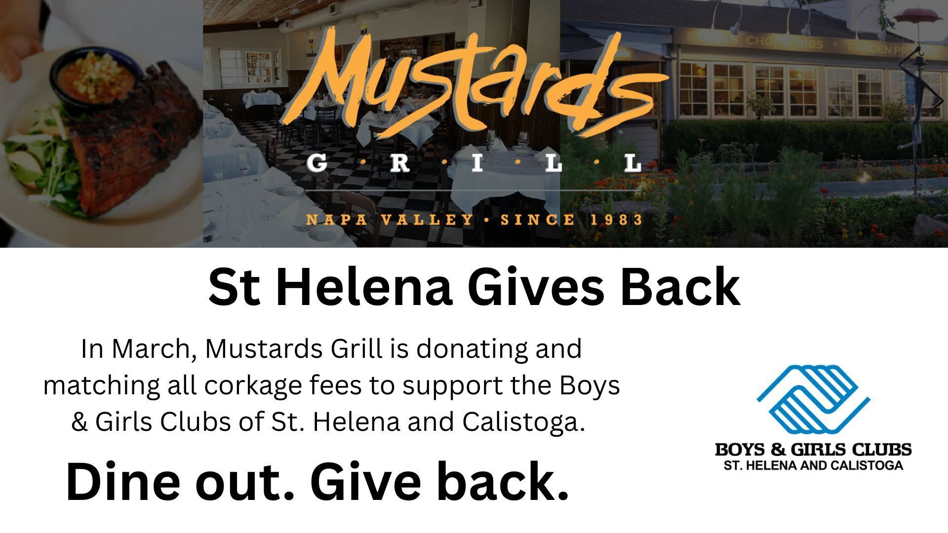 Mustards is proud to support the Boys & Girls Clubs of St. Helena and Calistoga. During this month, corkage fees are being donated and matched to support programs serving more than 1,300 local youth from St. Helena, Calistoga, and Angwin.
