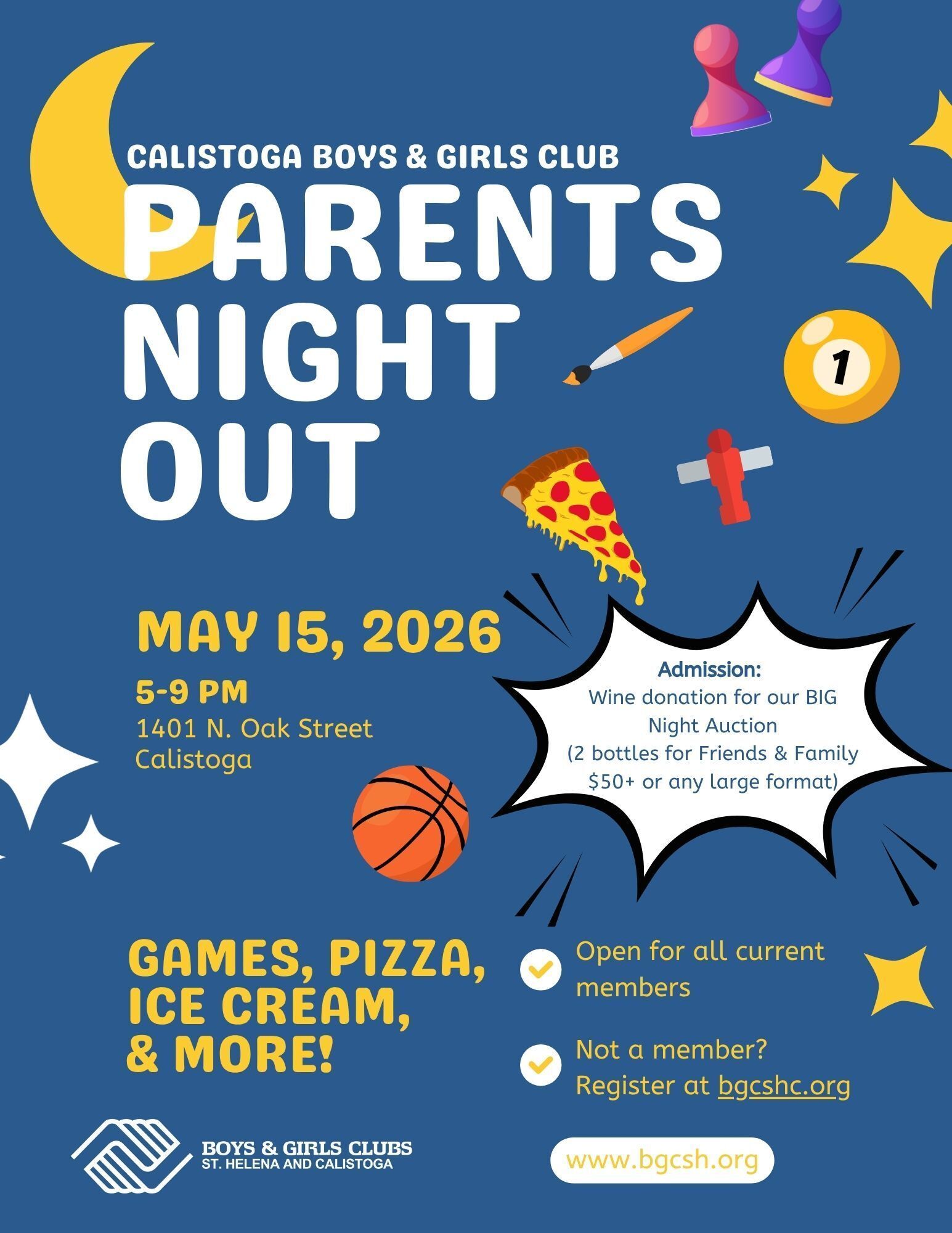 Parents Night Out is coming to the Calistoga Clubhouse on May 15 from 5–9 PM! This special evening is open to current members and offers a fun, safe, and supervised night at the Club. Kids will enjoy pizza, games, ice cream, and more while parents get a well-deserved evening off.